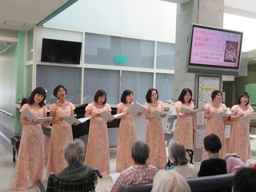 今回のミニコンサートは、約1年ぶりの登場で今回が7回目のご出演となります、コーラス プティ・タ・プティ様 と ピアノ伴奏 古谷小百合様 にお越しいただきました。今回も美しいハーモニーを数多く聴かせて下さり、また「リンゴの歌」では観客席を回りながら歌って下さるなど、観客の皆様が春の陽射しのように優しく暖かく包み込まれたコンサートとなりました。