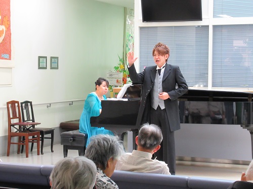 今回のミニコンサートは、世界的なイベント『音楽の祭日』に参加する形で行われ、初めてのご出演となりますバリトン歌手の高曲伸和様と、7回目のご出演となりますピアニストの藤渓優子様にお越しいただきました。バリトンならではの重量感のある、それでいて伸びやかな歌声と優雅なピアノの音色に会場が包まれました。コンサート1曲目では大江理事長がオペラの世界に招かれたり、コンサート終盤にはサプライズ?のアンコールが起きたりなど、楽しく素敵な「音楽の祭日」となりました。