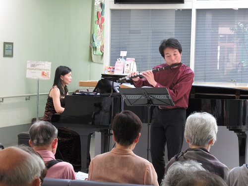 今回のミニコンサートは、2016年3月以来2年ぶりのご出演となります、フルートの山中 淳史様とピアノの前北 恵美様にお越し頂きました。前回のコンサートではフルートの名曲が中心でしたが、今回は聴き馴染みのある曲を中心に演奏を披露して頂きました。当日は、春の陽気を通り越して少々暑さも感じられるような日でしたが、会場にひとときの涼しさと安らぎを招き入れた清涼なフルートの音色に、お集まり頂いた多くの観客の皆様も、しばし暑さを忘れて聴き入っておられました。