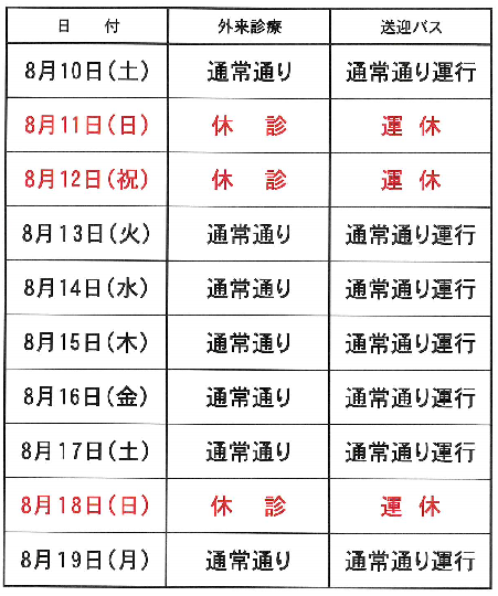 お盆期間中の外来診療は以下の通りとなります。