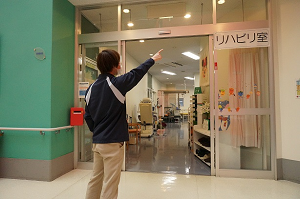 A君:「みなさんこんにちわ!作業療法士のAです。まずはリハビリテーション室からご案内します。こちらがリハビリ室の正面入り口になります。」