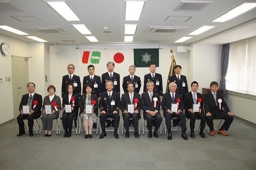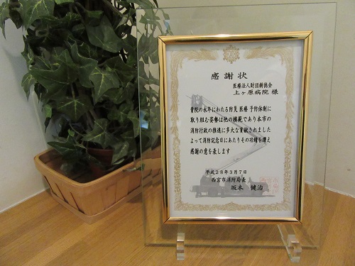 平成28年3月7日の消防記念日に市民表彰式が行われ、上ヶ原病院がその対象となりました。(写真右から3番目下段)